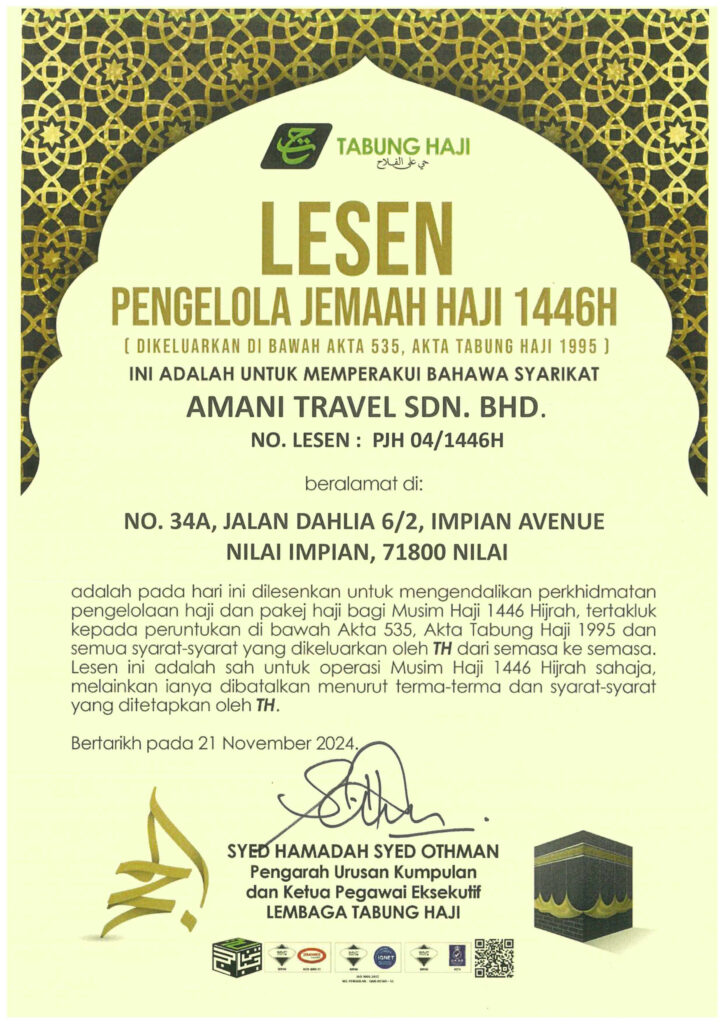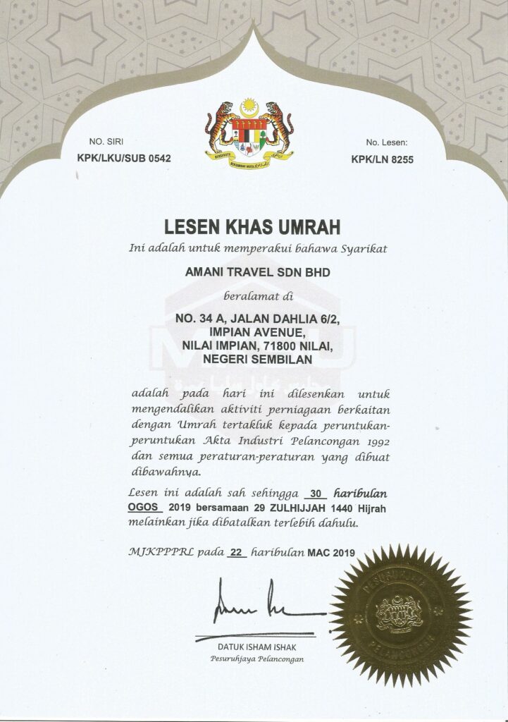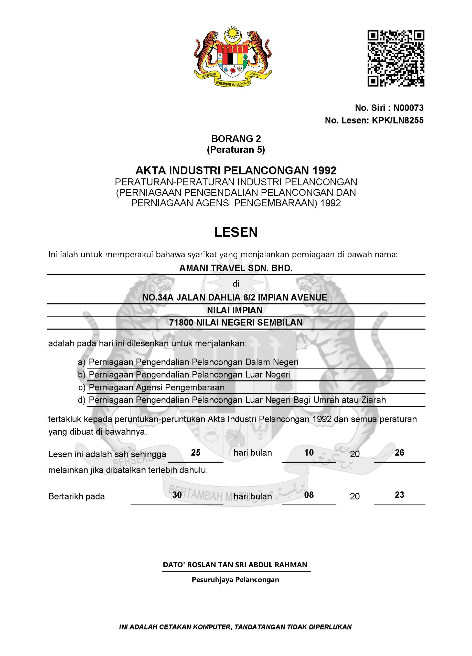 Amani Travel Sdn Bhd ialah syarikat agensi pelancongan berdaftar & berlesen penuh di bawah Kementerian Pelancongan.